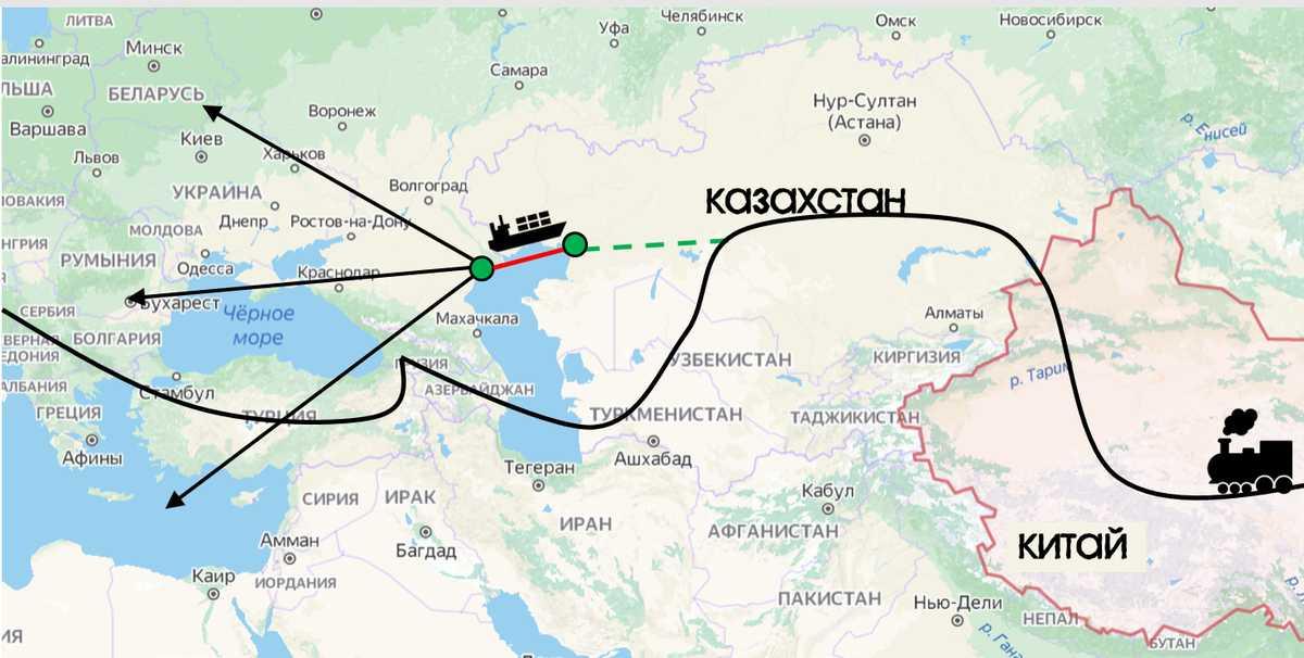 Для этого нужно только продлить ветку железной дороги, что идет через Казахстан, до Каспийского моря.