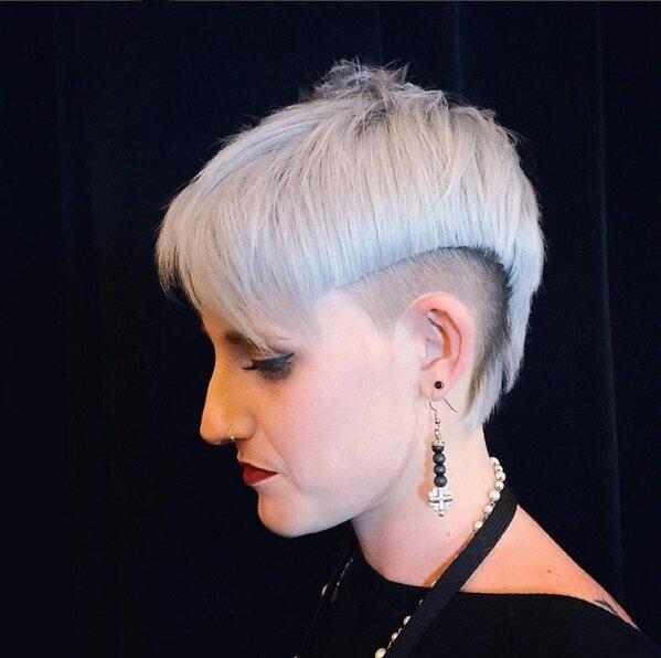 Оригинальный вариант стрижки с выбритым виском и «рубленым» срезом верхних прядей. С одной стороны стрижка выглядит вполне стандартно, с другой – супер-креативно. Холодный оттенок блонда придает этой стрижке еще большую экстравагантность.