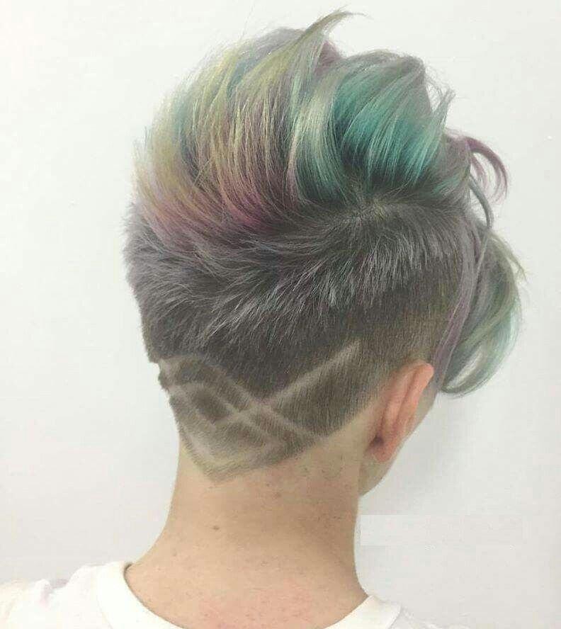 Стрижка с узорами на выбритом затылке и сложным колорированием в несколько оттенков. Окрашивание выполнено на верхних удлиненных прядей, которые подняты вверх и зафиксированы. В нижней части затылка выбрит оригинальный геометрический узор.