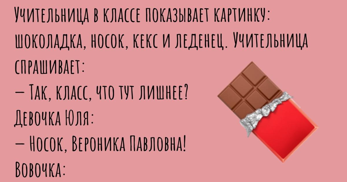 Какой ваш любимый, признавайтесь: темный, белый, молочный, с орешками, пралине, с ягодкой начинкой? Видов уйма, а итог один: НАСЛАЖДЕНИЕ. Шоколад, как известно, дарит радость и хорошее настроение. Анекдоты тоже, так давайте совместим? Чтоб уж вообще быть на позитиве и как сейчас принято говорить «на высоких выбрициях». Формула такая: плитку любимого шоколада в руки в зубы точнее и читать анекдоты ниже: